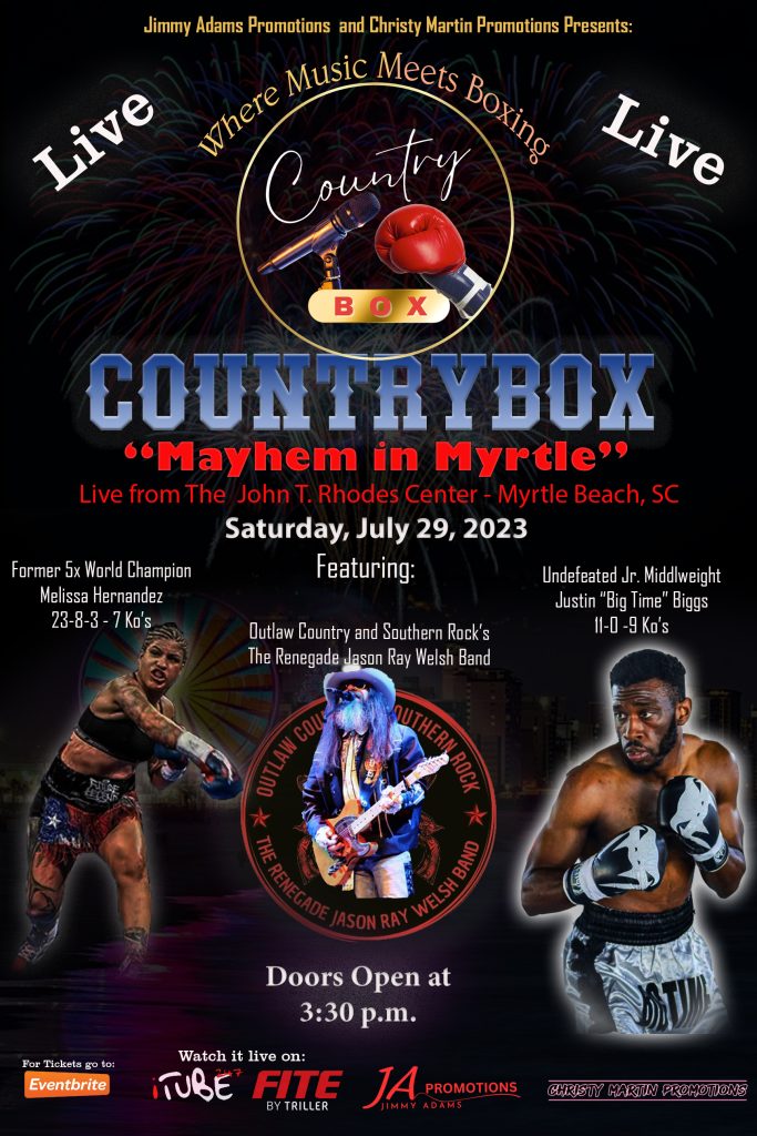 Country Box – Mayhem in Myrtle – “Where Music Meets Boxing” July 29, 2023 at John T Rhodes Center in Myrtle Beach South Carolina. Doors open 3:30 PM . Music Artist The Renegade Jason Ray Welsh Band. Pro Matches featuring 5 Times World Champion Melissa Hernandez and undefeated middle weight Justin “Big Time” Biggs. Order your reserved seat now at Eventbrite.com or watch it live on countrybox247.com & FITE.TV. For more information contact jimmy@jimmyladams.com or champchristy@live.com