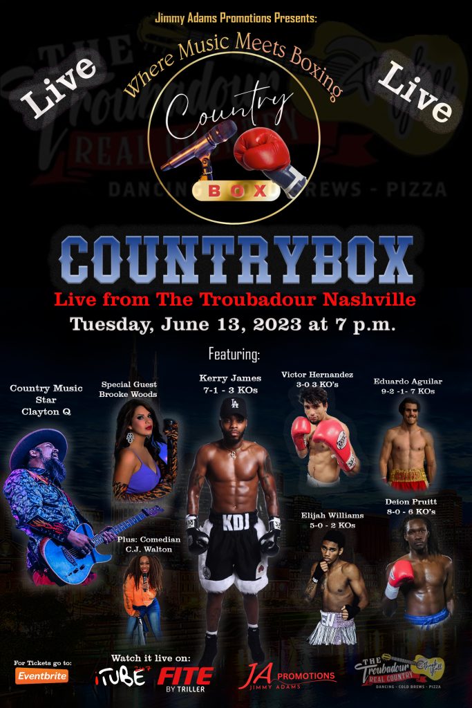Country Box “Where Music Meets Boxing” June 13, 2023 at The Troubadour, Nashville, Tenn. Showtime 7PM. Back by popular demand Clayton Q with special guest Brooke Woods. 7 Professional Boxing Matches featuring Kerry James, Deion Pruitt, Deron Meriweather, Jamer Jones, Elijah Williams & more. Order your reserved seat now at Eventbrite.com or watch it live on countrybox247.com & FITE.TV. For more information contact jimmy@jimmyladams.com Let’s sing & Box together